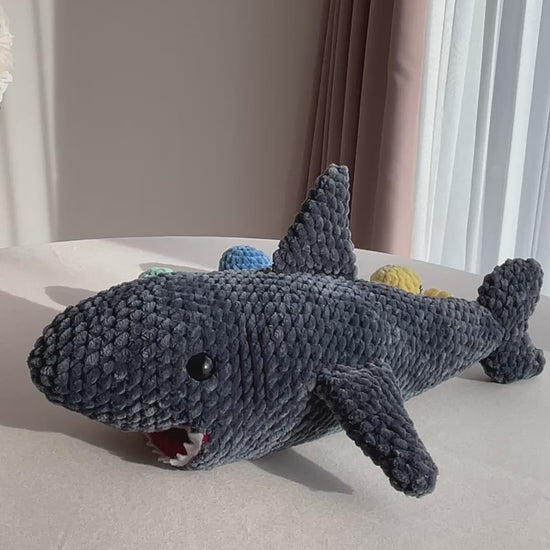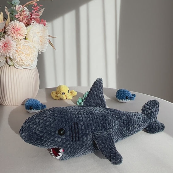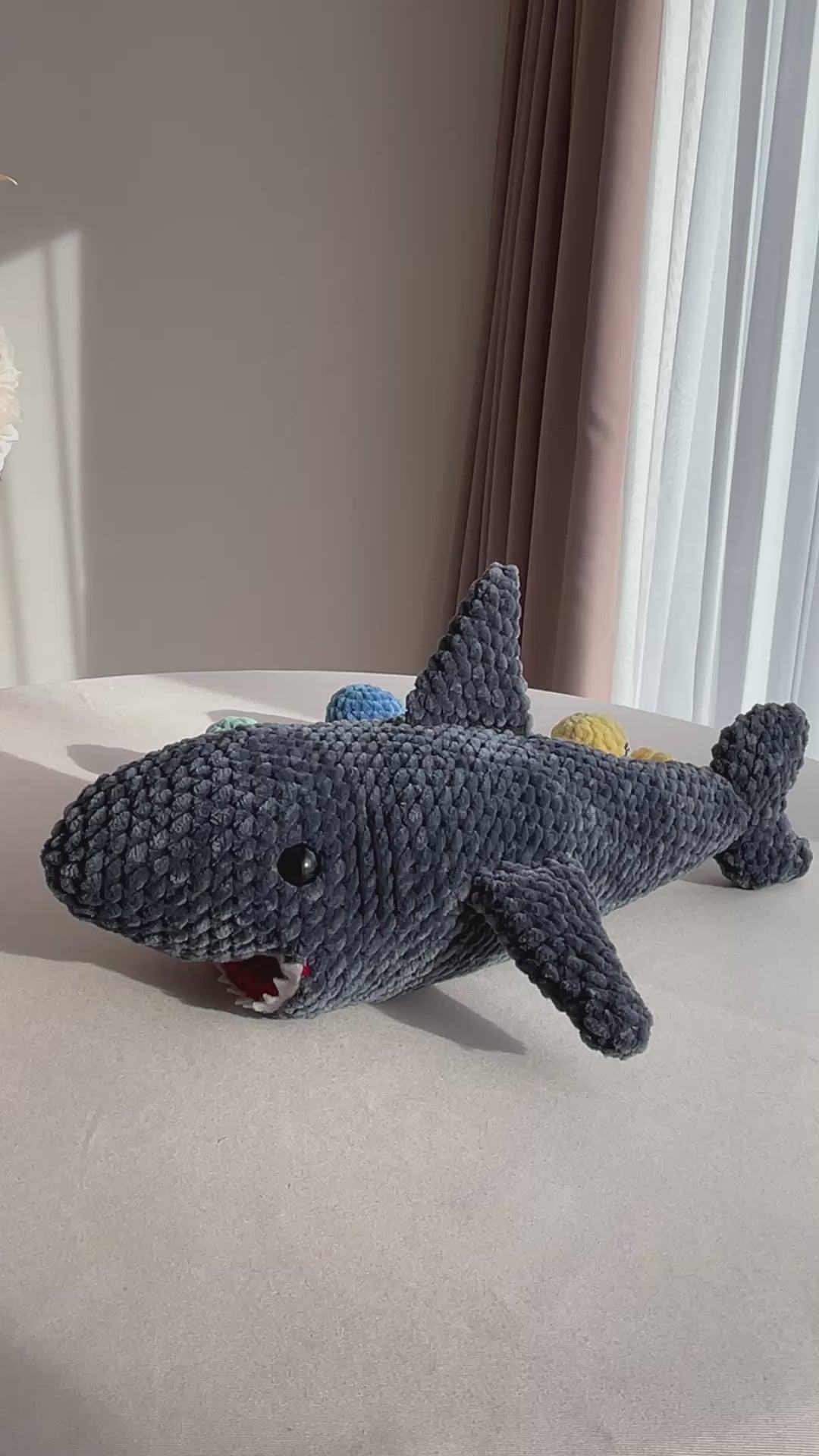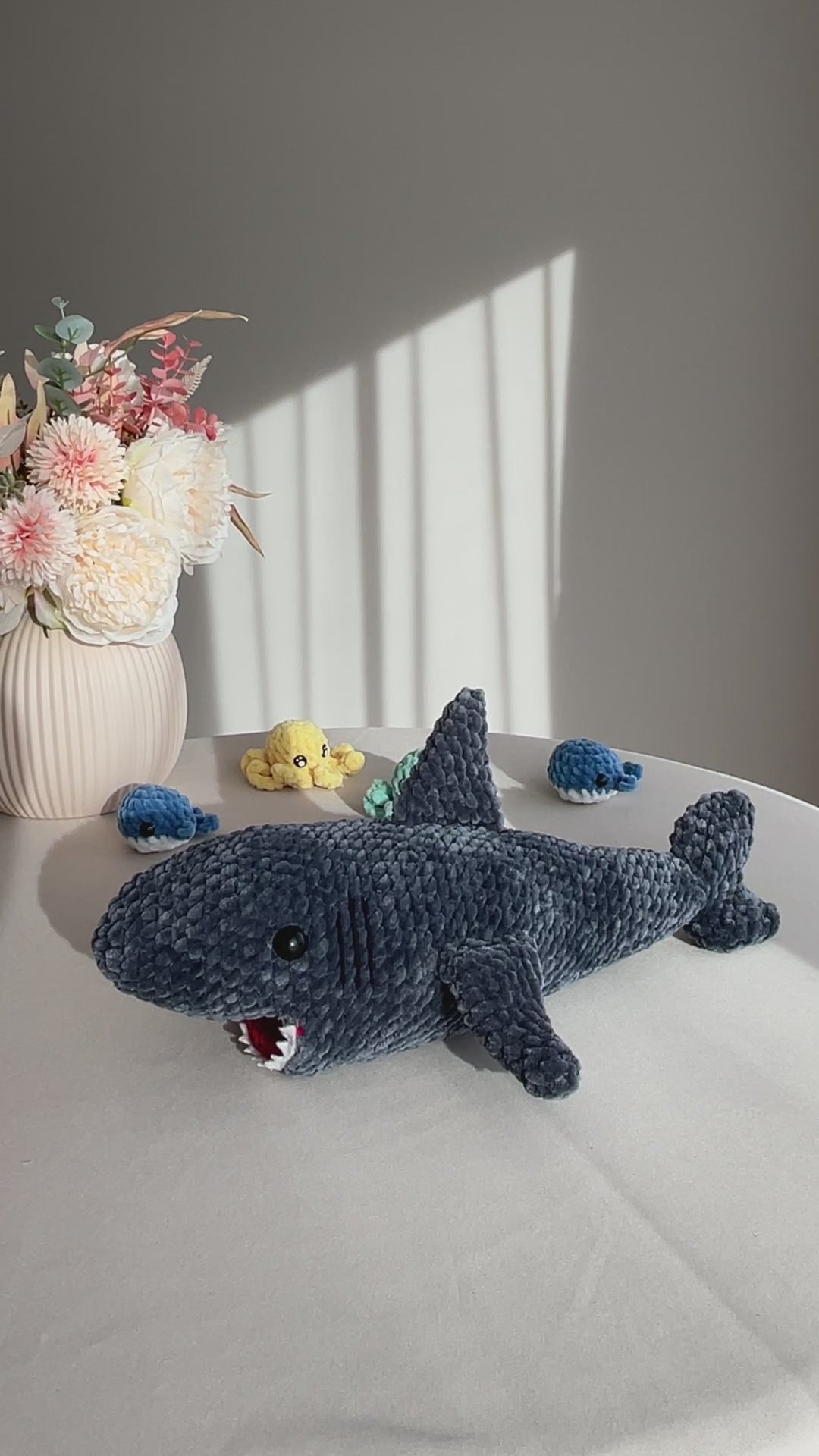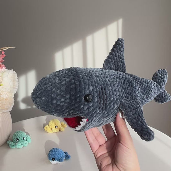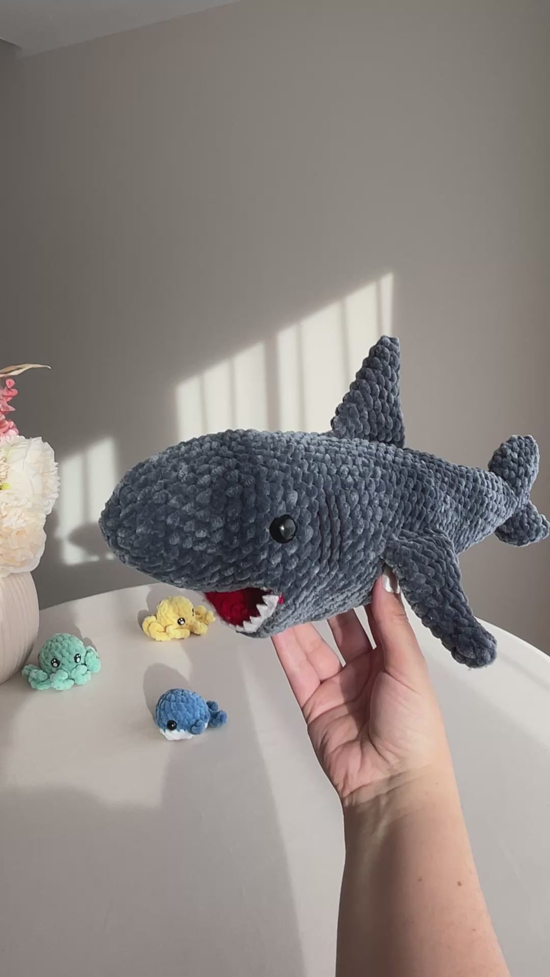 Meet the friendliest little predator of the sea! This crochet shark is designed with a playful twist — his red pouch “jaws” can gobble up your hand, or the tiny fish and whale that come along with him.
