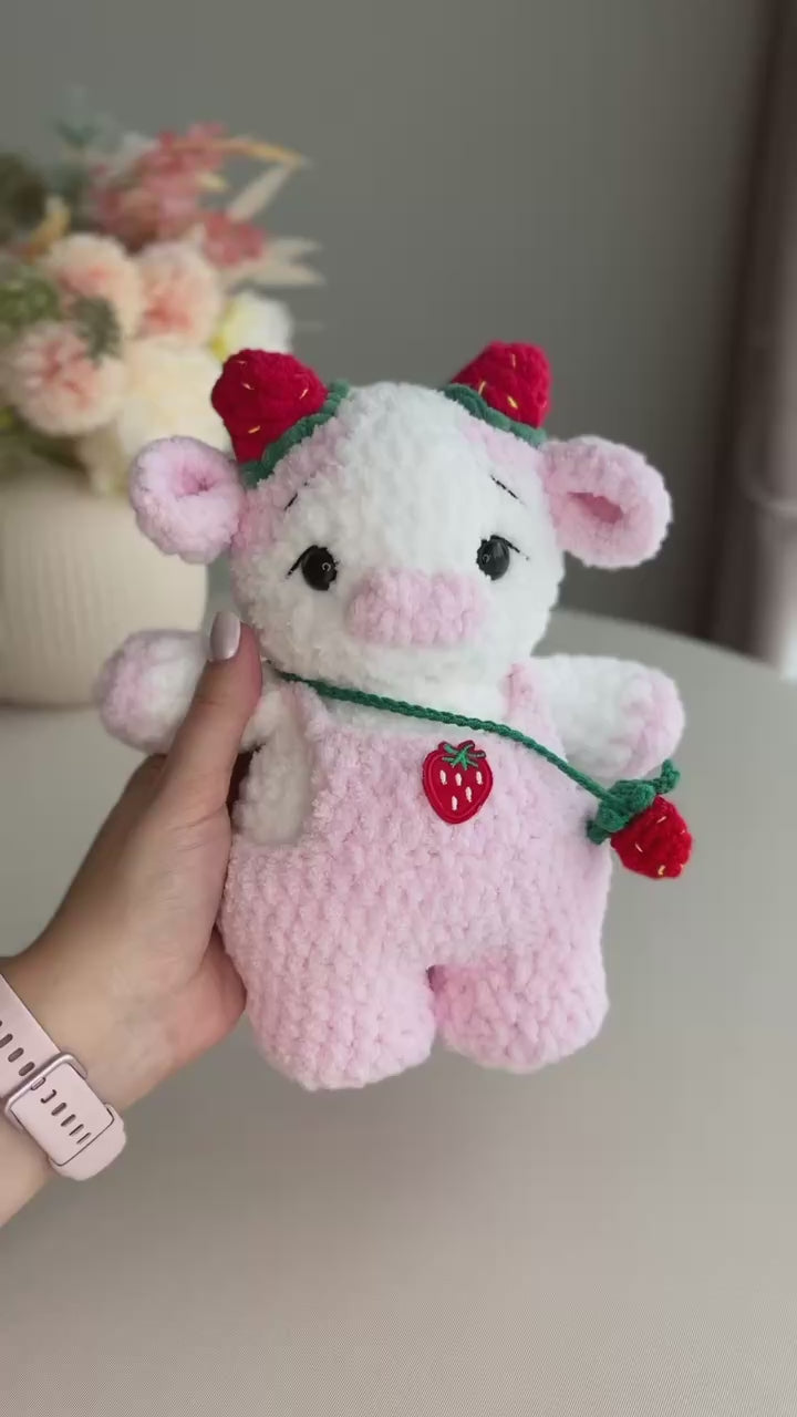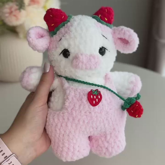 This adorable Strawberry Cow is lovingly crocheted with soft white and light pink puffy yarn and a splash of green for the leaves.